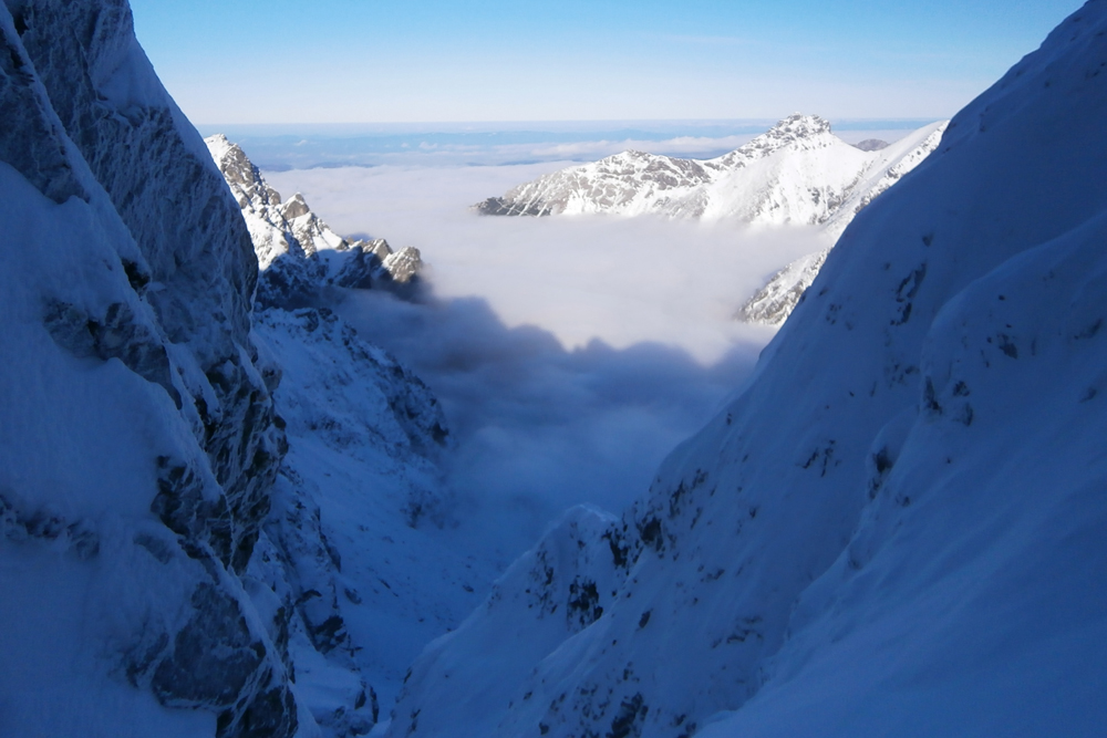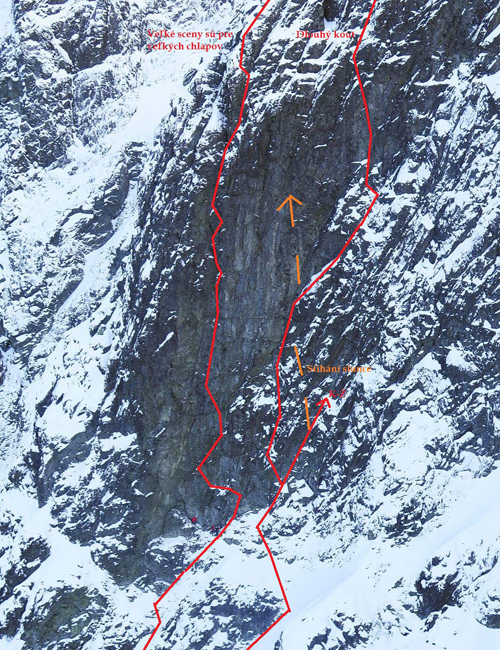 Mišovi, ale září oči a i přes naprosto nekvalitní sněhovou nadílku ukrajuje po dalších metrech, teď již pro něj známého Ľavého piliera. Občas nás podusí ve vlastní šťávě, kdy s Maťom na sebe jen tupě hledíme a přemýšlíme jak se dostat o pár metru výš, aniž bychom riskovali polet vpravo do Zdi, nebo zlámané hnáty při tvrdším přistání v svazích pilíře nalevo. Ale konec konců je to jak s tím medvěděm - dôležité je mať dost v püči.
