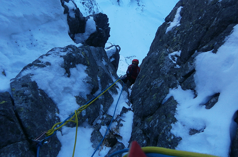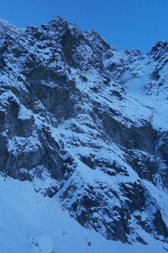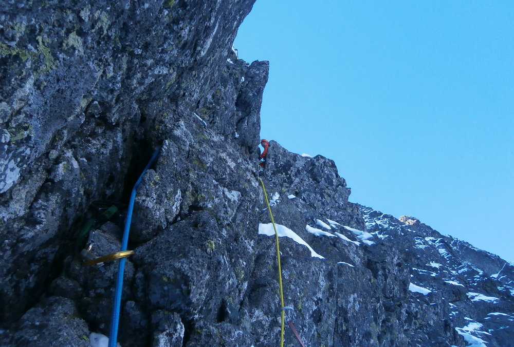 V rámci lezecké reality to pak byl klasický Áčkový komín s bouldrem na tření ve sněhu, kde jsem musel chtě-nechtě prolomit jakous krysu a navíc mi dosti odmrzl palec na noze. Naštěstí Maťo mrzl celou dobu na štandu na nohy obě (skelety jsme oba nechali u paní gazdovej dole) a neslyšel jsem taky nic o výškovkách. Tak jsme si byli fifty-fifty.