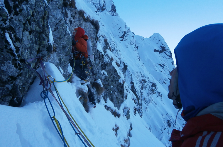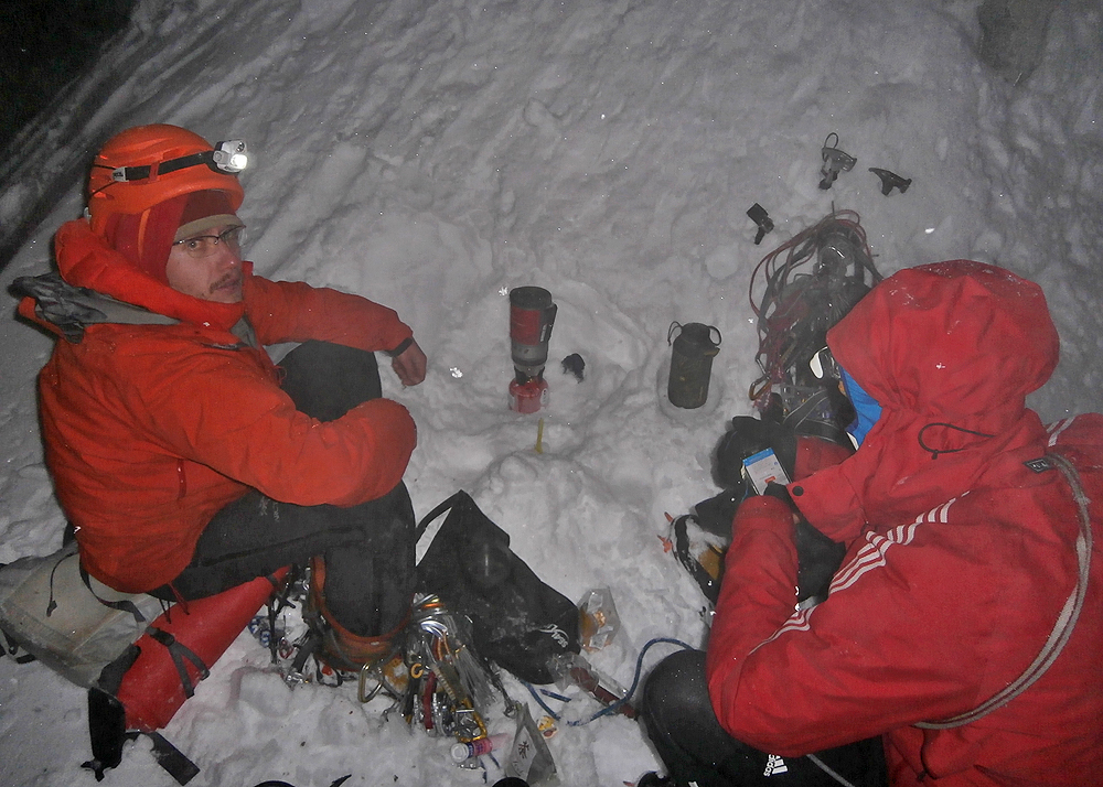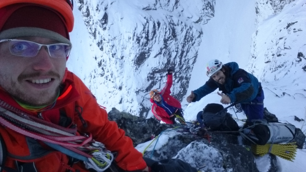 V sedýlku pod headwallem to s pokročilou nocí začíná vypadat na luxurusní bivak, ale Igorov telefonát o zhoršení počasí, zvýšený vítr a sněhová nadílka (beztak od Pšonů) nás nutí opět zabrat a trochu propotit už tak dost zvlhlé oblečky. Prostě povolanější seznali, že budeme-li odpočívat, nic nedoléčíme. Nakonec, bylo potřeba, aby nás zaslúžilý majster športu ještě cos naučil. Nie su zlé podmienky, len neuvedomilý ľudia. Dolieza sa na vrchol, nie do sedla. A nezabudni na čerešnišku na koniec. Což se mu parádně povedlo v podobě přelezu předposlední délky široké spáry ne nepodobné té v Pirani na Slavkováku. Že prý za IV. A v zimě max. M5. Realita však byla opět jinde. Jako bych téměř hned cítil pokrok v léčbě. M5 bylo akorát v úvodní plotničce a zbytek byla lahůdka pro kteréhokoliv drytool specialistu, kde i Mišo skonstatoval, že mu tak riadně už dlho nenatieklo. Jen dodám, že poryvy větru a skučení hory, nás posouvají spíše do filmové reality kteréhos z akčních filmů. Nož nějaké to dráma to taky přec chtělo, než?