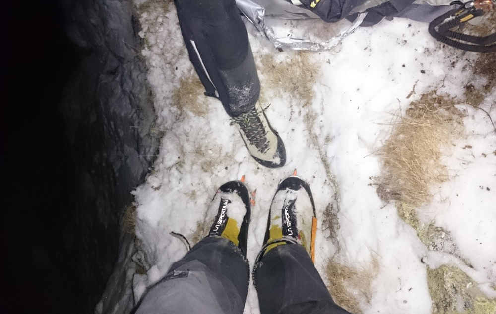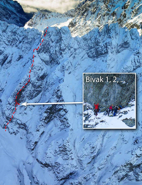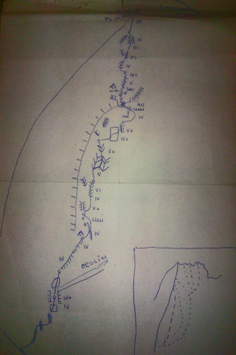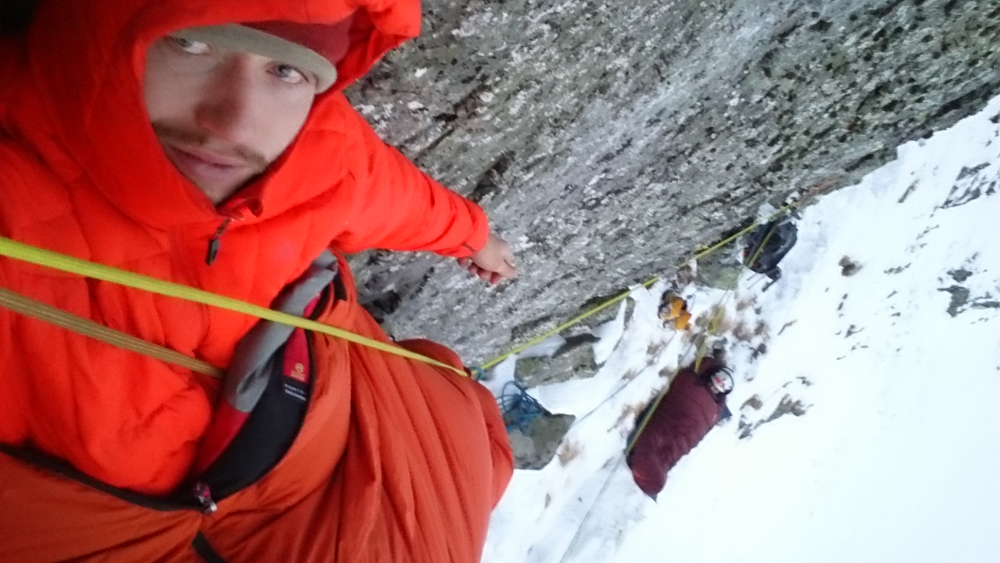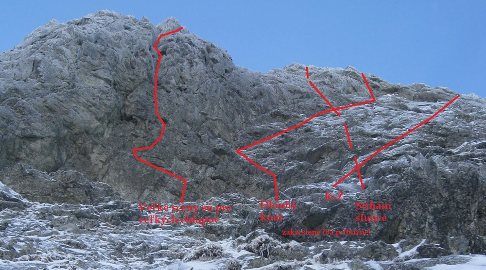 Co však přestávalo fugovat bylo schéma Dlouhého koutu. Začínali jsme tušit, že i přes Pawlovi poměrně detailní informace k cestě se spíš realizujeme v projektu, o kterém nám před časem vykládal Čumpelík a ke kterému nás narozdíl od Dlouhého koutu nabádal: Jestli někdo neumí volně vylézt Dlouhý kout? Však tam jsou asi jen dvě těžký místa navrchu. To je docela dobrý zimní lezení, rajbáky valíš v botách, tam si zalezeš. Ale žádná příhoda s Mauglím tam nebyla, to je prostě pohodové lezení. Jediná věc co nám nevyšla, tak jsme netrefili polici na druhý bivak, spali jsme na takový úzký potvoře. Zato vlevo je tam parádní směr, který by stálo za to vylézt!