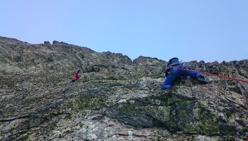 Ráno jsme si ještě cos pospali (za ty prachy aby ne!) a dle domluvy se do čistě skalních pasáží pouštíme spolu s Maťom. Borec, že chce riadny boulder, a tak ho oklikou navádím do nepříjemné pasáže, kde je nutné být ve střehu, umět lézt, nezapoment se zajistit a zárověň nesmí nic shodit na kuchyňku paní gazdovej, toho dne v podání Miša. Nakonec to borec zadeli riadne. 8ačko sice normálně krokuje poloviční dobu, ale furt cos drmolí o věšení bannerů, a tak jej pro jistotu posíláme opět jen v lezečkách ještě o délku dál a výš, aby přece jen ještě vystřízlivěl. To se už i zlepšila kvalita skály, Maťo rozdýchal težší místa a já byl za svou trpělivost odměněn parádně designovým komínem jak od Ference Futuristy.