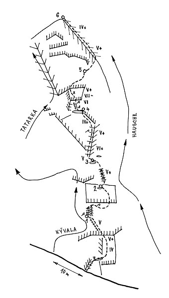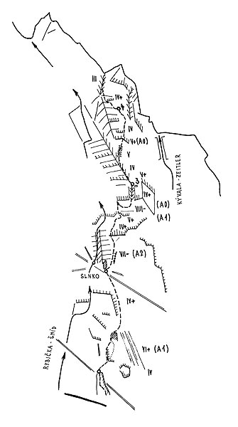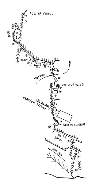 ![]() Východný štít nad Železnou bránou, JZ stena „Cesta na pamiatku Ľ. Gibasa“, Josef Kulhavý – P. Mikuš, 26. 6. 1977, 8 hod., použili 6 druhov skôb, 2 bongy a 2 kliny |