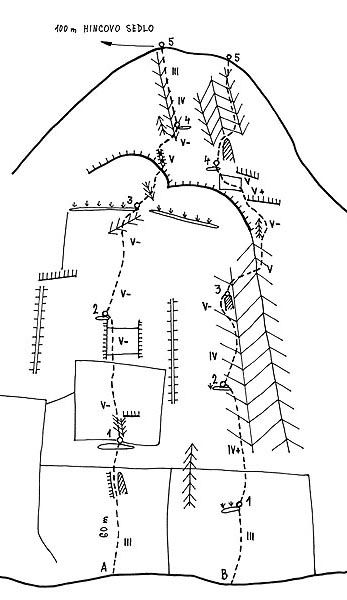 ![]() Mengusovská vežička, J stena, A: Andrej Belica – Ján Porvazník, 31. 8. 1976, 3 hod., B: Andrej Belica – Ján Porvazník, 31. 8. 1976, 2,5 hod., použili 10 skôb a 3 hexentre, pekné lezenie v pevnej, vodou vymytej skale, stienka je jasne viditeľná od Hincovho plesa, chrakterizujú ju dva previsy v podobe očí |