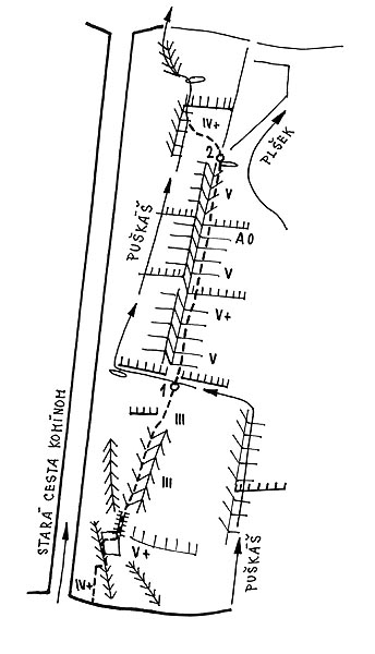 ![]() Malý Ošarpanec, J stena, cesta „Teoretická mechanika“, Štefan Halvoň – Igor Koller, 29. 6. 1973, 2,5 hod., použili 10 skôb, zabudnutá pekná cesta asi doteraz bez opakovania |