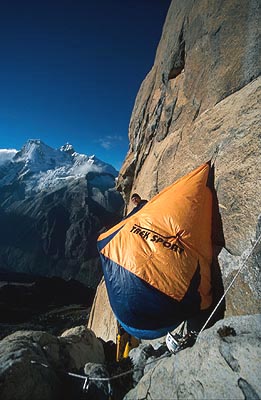 portaledge a Amazonka na Sfingu, 5325 m vysoký kopec v Cordillera Blanca v